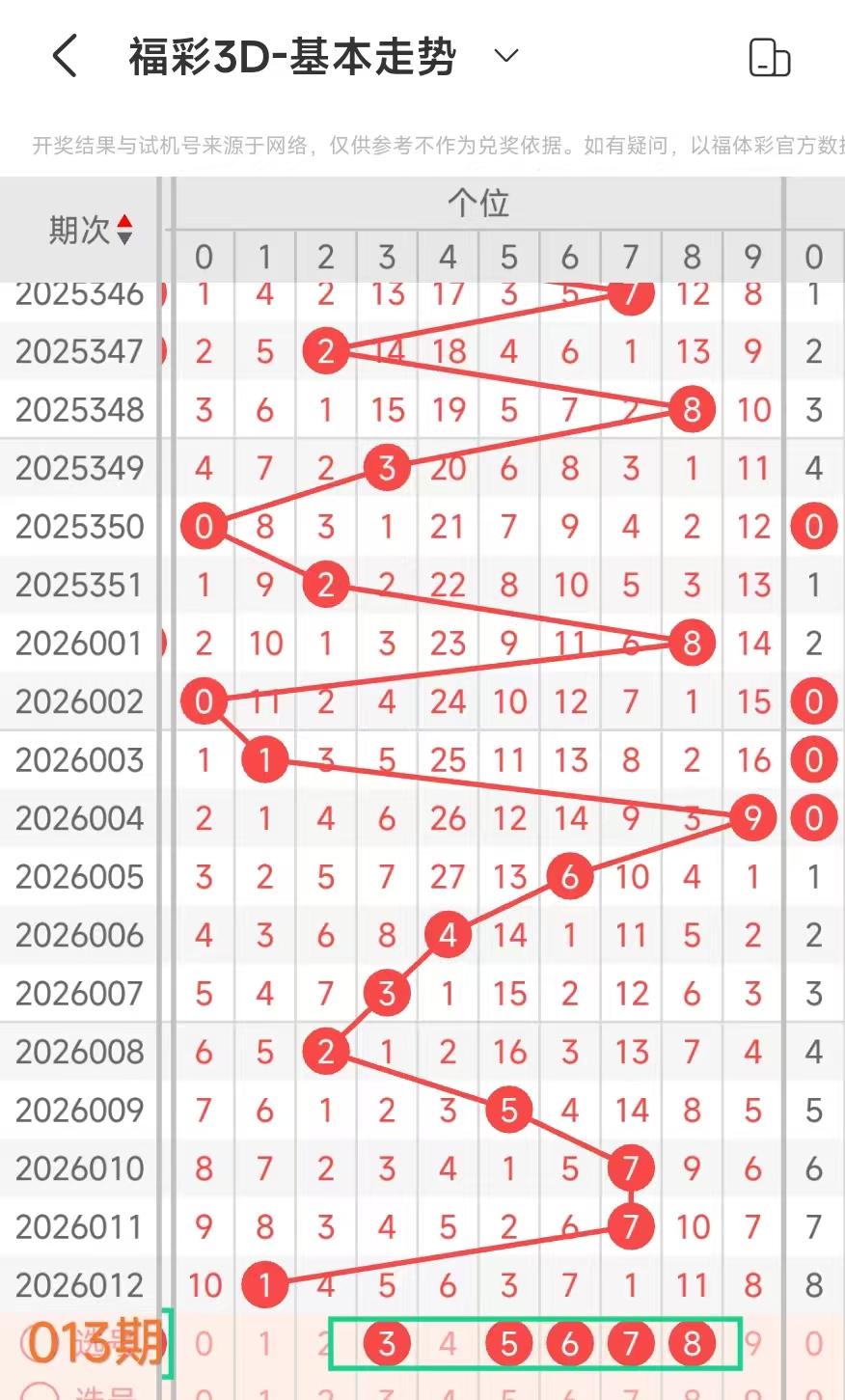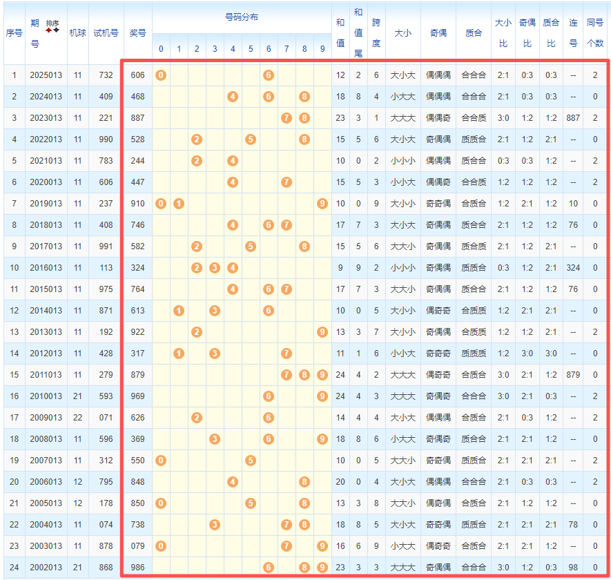 经统计0号出现5次、1号出现3次、2号出现6次、3号出现5次、4号出现7次、5号出现4次、6号出现9次、7号出8次、8号出现9次、9号出现7次.统计后出现次数靠前的数字作为我们的备选号码.其号码有246789等