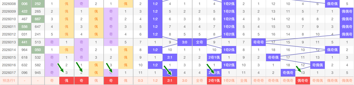 (二)、奇偶分析 奇数 13579 偶数 02468 在这5期 数据中 奇数出现9次 偶数出现 6次 从昨天出号来看奇数占优, 本期看好偶数有号 看好 偶奇奇 奇偶奇