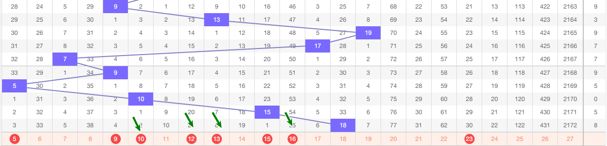 本期看好 范围5-23 之间定和值10-12-13-16从图上来看近5期的和值 9 5 10 15 18 10 1路和值 9 15 18 0路和值 5 2路和值本期看好0路和值参考 这五期和值波动不大 下期防守大波动