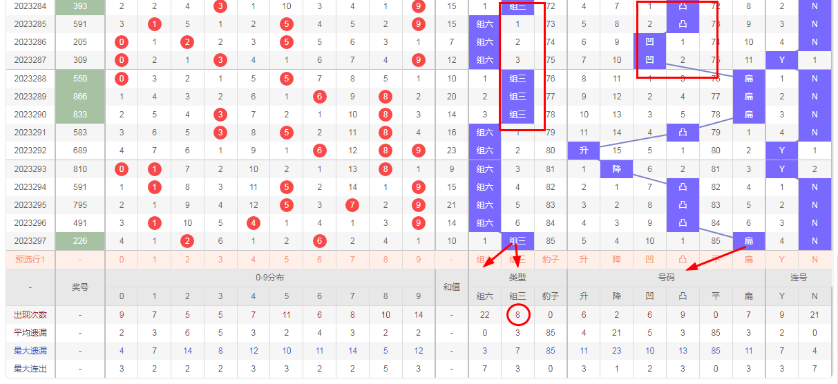 类型图分析:以历史30期为例组三和组六的比为8比22,平均一下相当于出3期组六就会有1期组三。现以连续出了6期组六后终于开出一组组三平衡了一下比例但组三形态依然还有开出风险。所以结合类型走势图预判福彩3D第298期形态推荐组六形态防守组三。
