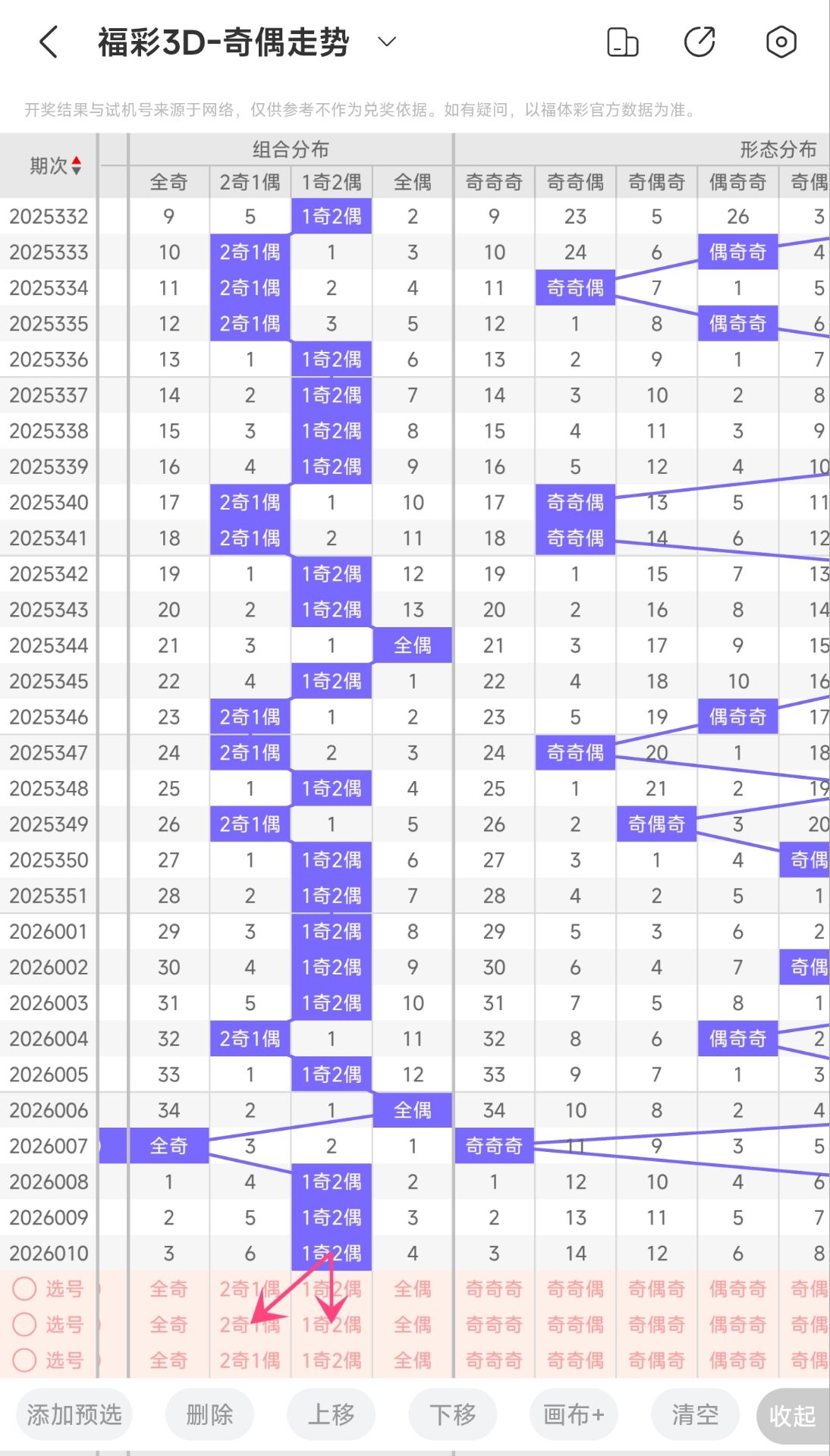 上期开了1奇2偶的情况,往前一期开出的是1奇2偶。从组合数学理论上来讲,开出2奇1偶和1奇2偶的概率都为37.5%,开出全偶和全奇的概率为12.5%。通过分析目前30期内的数据。本期的开出全偶的概率是6.66%,开出全奇的概率为3.33%,开出1奇2偶的概率为60%,开出2奇1偶的概率是30%。和前一期相比,概率没有变化。通过走势图可以看到,连续开了3期1奇2偶,本期比较看好2奇1偶回补。所以本期推测可能开2奇1偶,其次是1奇2偶,然后是全奇或者全偶类型。