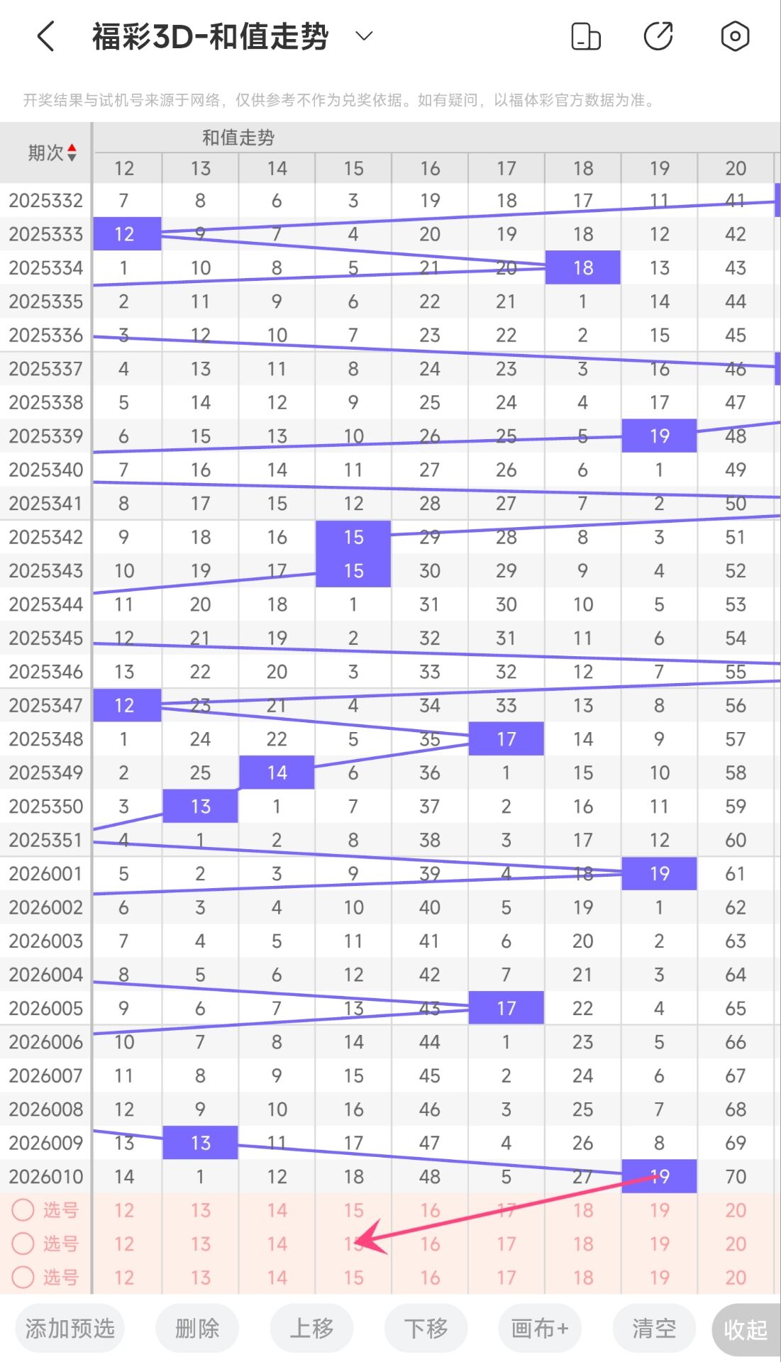 上期和值是19,往前一期和值是13。和值往右移动,偏移振幅为6。19值也是处于近30期内开出比较大的和值。上升的空间比较小,下降的空间比较大,本期看好和值变小,所以本期趋势是大概率往左的。因此推测本期和值趋势是大概率往左的,和值变小,小概率往右,和值变大。