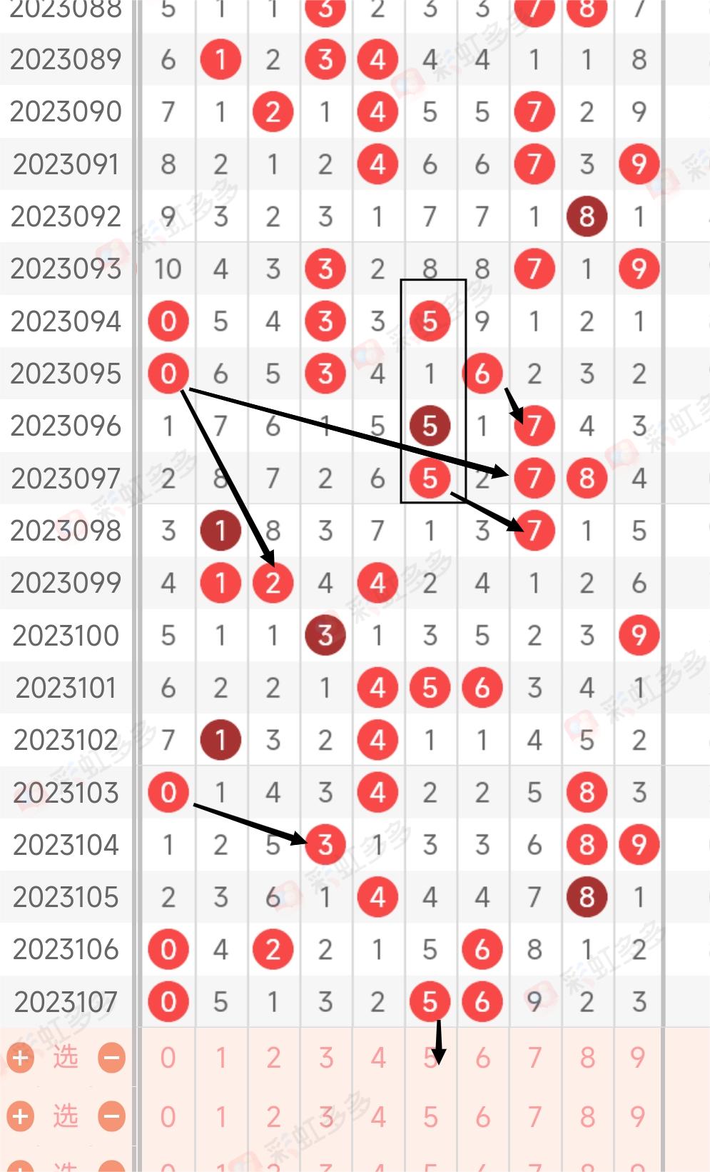 大小周期走势:上期百位开出小号球0号,012路中是0路球,大号球连出二期后转开小号球0号,偶数三连出的情况下,本期转变奇数的可能性是小编所看好的,因为2023094期和2023096期之间的走势,百位的一个反复横跳,本期开出号码球6号的可能性是比较大的,目前从大小周期来判断大号的连出被小号中断一期跳回大号的可能性是比较大的,所以本期百位的奇数号球和大号球可以当作重点参考对象,如往期走势号码球6号需要防范!
