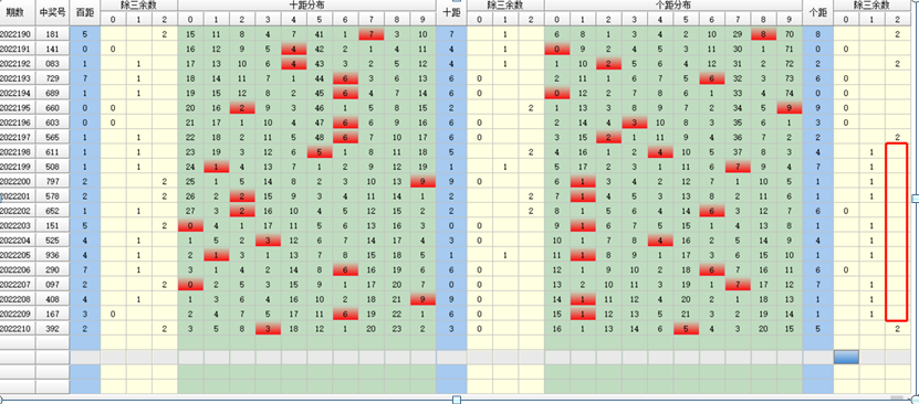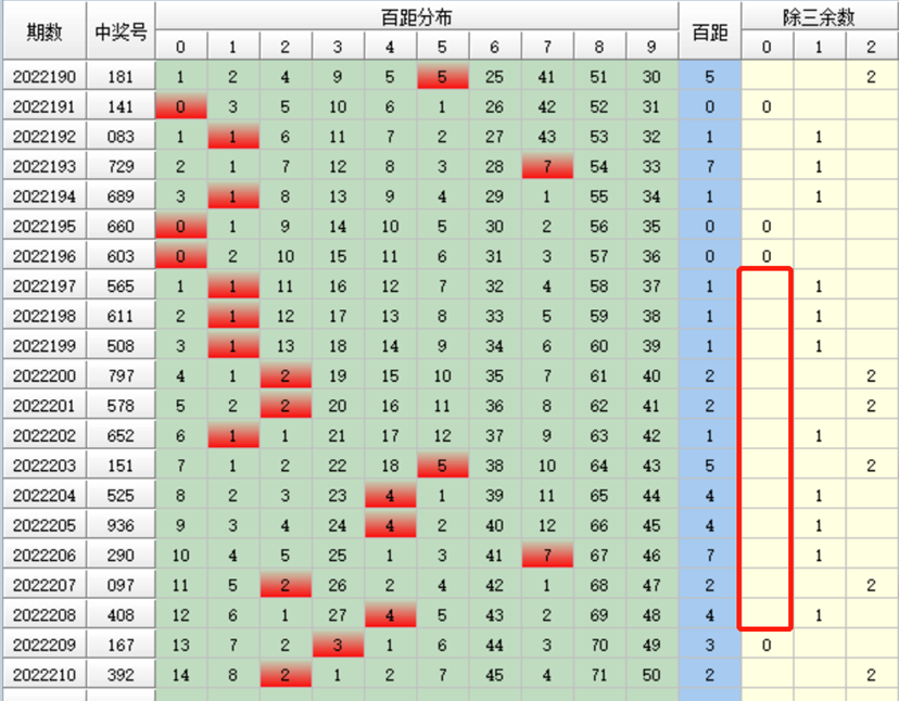 同样的道理来到了号码的个位上,我们看看近期个位号码的个距除3余数吧。