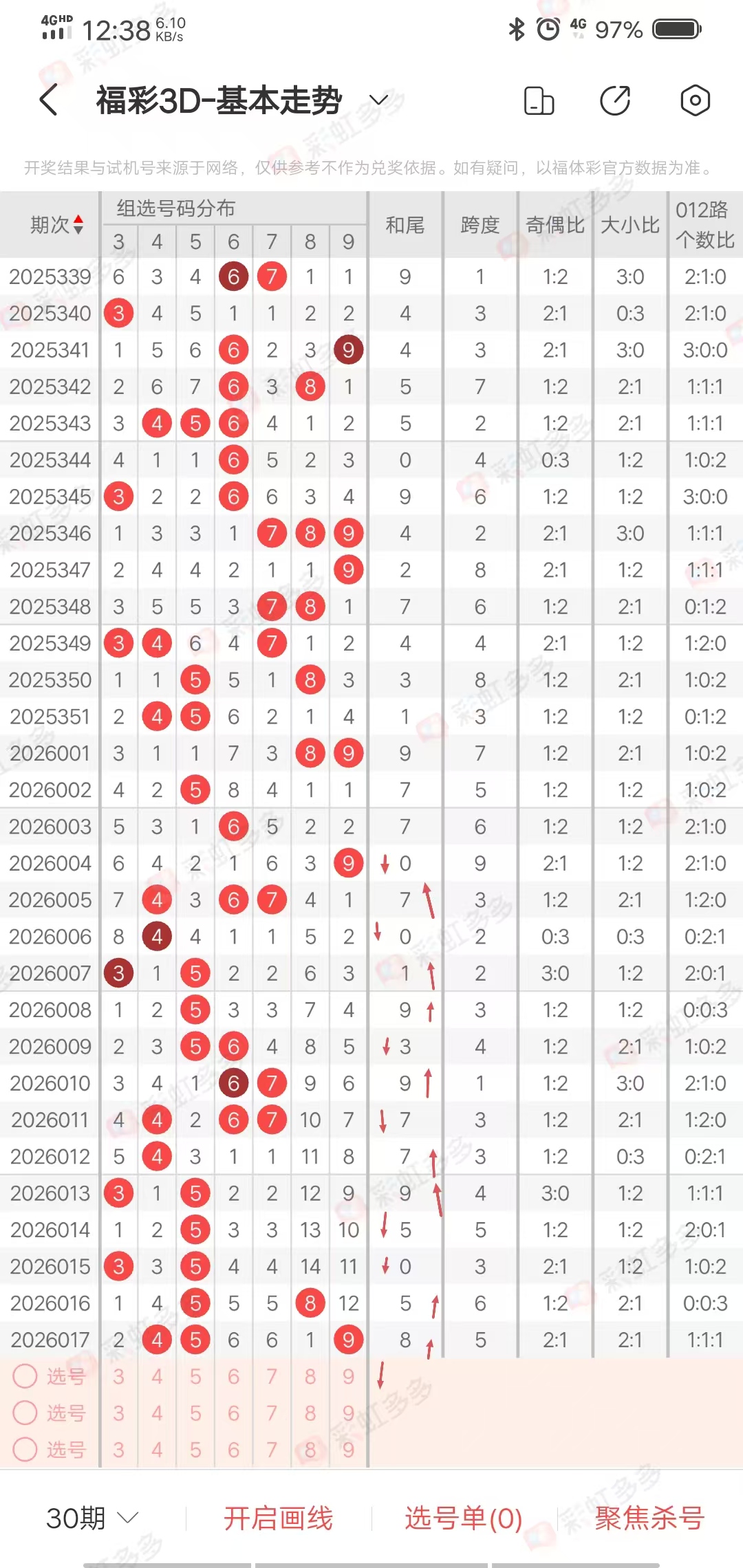 以上所有过滤条件并没有每期都是正确的,都是依靠各种数据环环相扣,总结出来的,我们在参考的时候,要抓住重点,比如和值小,大小1:2概率占大,比如跨度小,胆定小,那么789出现概率就小,9可以排除。当奇偶比或者大小比出现三期连出,第四期,很大概率是不出,尽量只做防守。