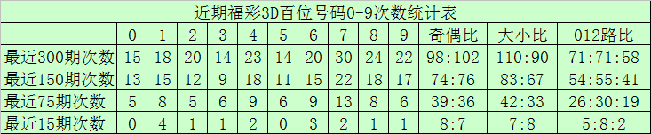 百位分析:最近300期奖号由冷到热表现为:1523,024,225,328,630,8933,440,741次,奖号奇偶比为148:152,大小比为160140012路比为115:104:81