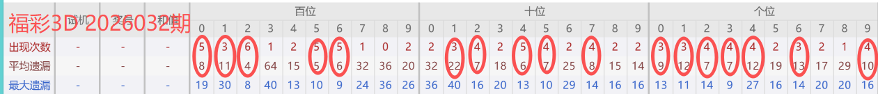2026029期开奖号码003,我们可以看出近30期百位0出现5次,十位0出现2次,个位3出现4次。