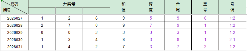 2026027期开奖号码126,我们可以看出近30期百位1出现1次,十位2出现4次,个位6出现3次。