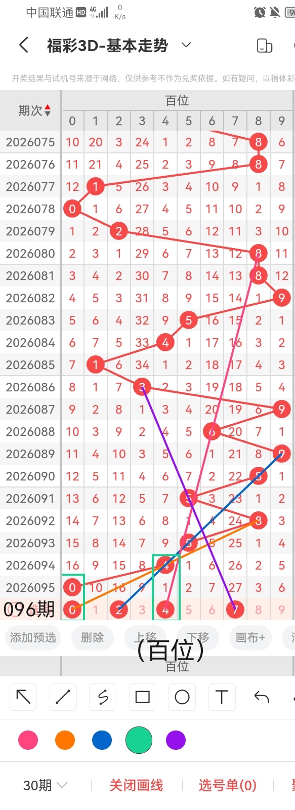 首先,小梁在这里给大家分享一个粉丝福利,给粉丝提供每期福彩3D杀一百位的号码:1;准确率高达95.36%。其次,小梁结合上图中画线的思路走位分析得出,号码0与前几期开出的号码呈直连回补的走势且呈斜三连的走位,跨度是0;遗落16期未出的号码2与前几期开出的号码呈斜五连的走势,跨度2;号码4与前几期开出的号码呈斜三连的走势且呈隔期回补的走位,跨度为4。然后,小梁结合上图中的画线思路走位分析得出,遗落27期未出的号码7与前几期开出的号码呈斜三连的走势,跨度7。综上所述,小梁推荐百位的号码是:0、2、4、7。