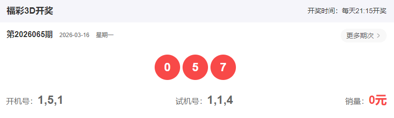 2026065期福彩3D开出奖号057,属性为组六。