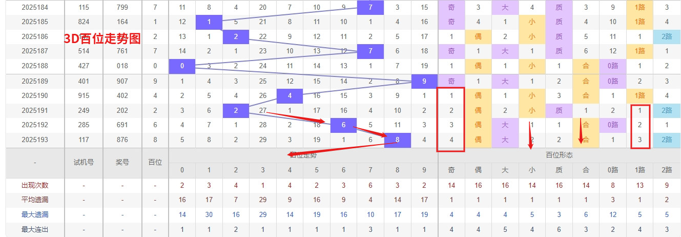 福彩3D百位分析:第2025193期百位开出号码8属于大偶数,从上面百位走势图上可以看出近100期大小比约为54:46奇偶比约为55:45。近期数据还是比较极端的符合文章开头介绍的求均衡规律非等量现象。但这种均衡不会持续最终会被偏态运行打破,然后循环往复。但短期内大小相差2点,小数过热大数有回补需求本期个人认为走大数的概率更高。上期百位落号“8”号球,在百位号码开出2路号码8后向大数方向走出2个振幅。那么通过分析上期百位落位号码分析,号码走出2个振幅,号码走为大偶数,开出2路号码8。通过对百位落号趋势来分析,百位号码落位后端,通过对近10期的走势来看百位号码大小交替频繁走2期大数又走3小数,最近大数比较强势,本期有继续走向大数号码的概率。那么本期我们在对百位号码进行分析时我个人的考虑百位号码会走出大数号码球,近期3D百位走势呈现明显冷热分化,冷号方面0和3持续低温,其中3已遗漏长达29期,接近历史极值,回补需求强烈;而热号7近期表现活跃,多次连开,短期内仍有持续走热的可能。采取"防冷追热"策略,在关注7连开趋势的同时,重点防范冷号3的触底反弹,同时兼顾0的回补机会。 我们在百位关注的重点在03679这5个号码球上,百位号码近期奇偶切换频繁,8号球码属于2路号码偶数,现偶数开出过多有向奇数的趋势。所以福彩3D第2025194期百位看好03679。本文由一起彩钱是生命动力所著,请勿转载