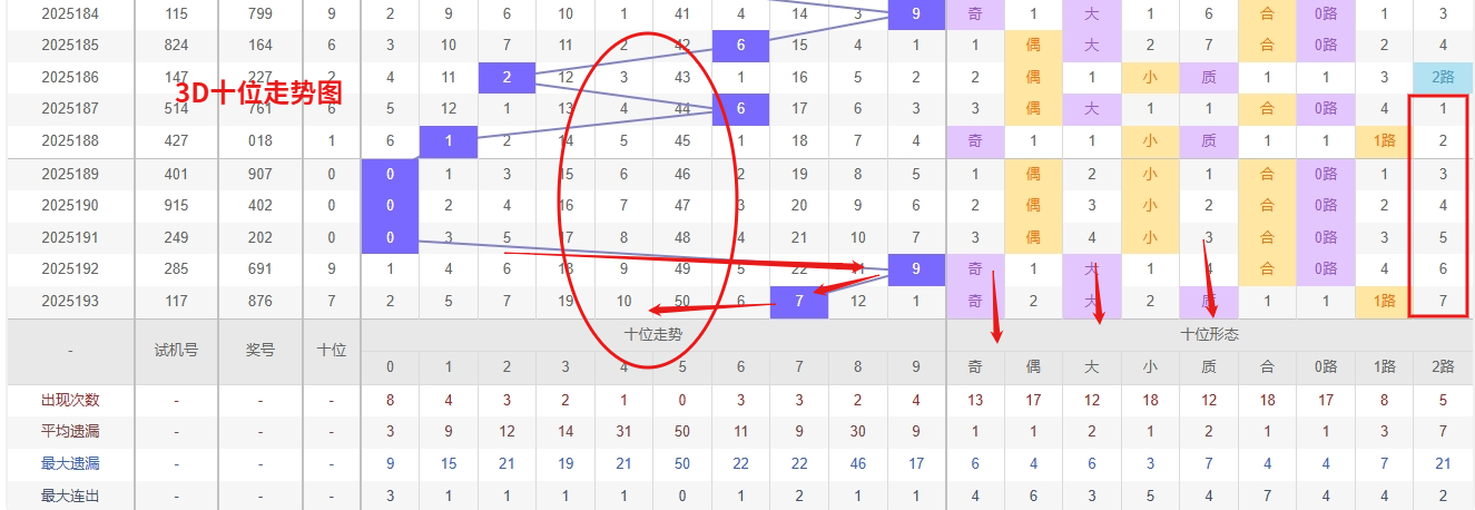 福彩3D十位分析:第2025193期十位开出号码7属大奇数号码后端。以历史100期数据为例十位奇偶比约为49比51,大小比约为53比47近期大小相差2点,根据求均衡的规律开出大数的概率比小数高一点。上期我们分析偶数经过连续回补后有走奇数的可能,开出奖号7大奇数符合我们的预期。从近期3D十位走势来看,号码分化较为明显,热号7刚刚开出,但根据历史数据来看,该号在热出阶段常有连开记录,因此仍需防范其继续走热的可能;而冷号方面,4和5长期处于低温状态,特别是5已遗漏长达50期,远超平均遗漏值,回补压力极大,极有可能在近期迎来强势反弹。虽然7的热态仍在延续,但冷号5的超长遗漏已经达到临界点,随时可能触底回补,在关注热号连开的同时,重点防守冷号5的强势回补,同时兼顾4的跟冷可能。 综合来看,近期十位选号可采取"守冷防温"的策略,重点关注冷号5的回补机会,同时兼顾8的反弹可能,并适当留意温号2和3的间歇性表现,合理搭配号码组合,所以福彩3D第2025194期十位推荐14567。本文由一起彩钱是生命动力所著,请勿转载