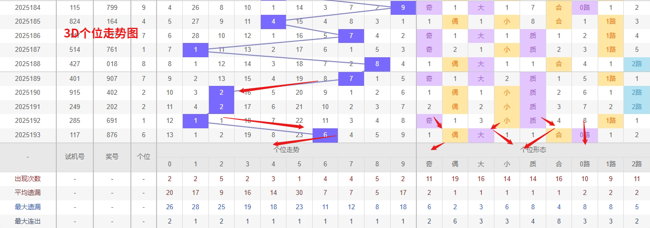 福彩3D个位分析:第2025193期个位开出号码6属于大偶数中端,从以上个位走势图中可以看出近100期的大小比约为55:45奇偶比约为51:49大小奇偶数据上有点差异有需求但不是太明显,不太好看这时就要借助连线走势和遗漏数据来帮助我们缩水号码。上期个位落号“6”大偶数0路号码球,号码开出了5振幅,连续多期的小振必被大振幅取代幅符合我们的预期,那么本期我们在个位考虑振幅走势走前依然要转变思路考虑大振幅,具体考虑(1-5)个振幅是我们主要的方向,那么在对个位落号情况进行系统的分析时我们可以明显的看到个位号码走势呈现大范围震荡,尤其是在号码的落位特点上表现的尤为突出,那么本期我们在个位分析时就要注意号码的风险,避免出现踏空。从近期3D个位走势来看,号码冷热分化特征相当明显。热号方面,2和8表现尤为抢眼,不仅开出频率高,还经常出现连开走势,这种强势热态短期内很可能还会延续,必须重点盯防。而冷号5的表现则截然不同,已经连续多期未见踪影,遗漏期数不断累积,从概率角度来看已经严重偏离正常值,回补需求日益强烈。采取"冷热双盯"的策略,一方面继续跟进热号2和8的连开趋势,另一方面也要开始布局冷号5的反弹机会。因此福彩3D第2025194期个位看好23058。本文由一起彩钱是生命动力所著,请勿转载