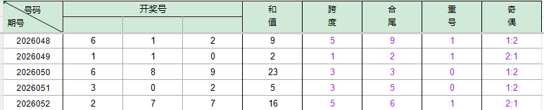 2026048期开奖号码612,我们可以看出近30期百位6出现1次,十位1出现4次,个位2出现5次。