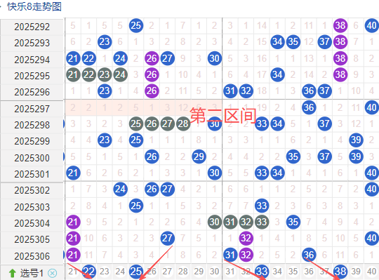 上期二区开出4个奖号(21.31.32.36.)上期回顾二区开出4个奖号二区间在上期落位同比前期的话呈现了一个不变的落位趋势,先来看本期号码22整体活跃度较一般,在近 30 期里有一定的间歇性出现,不是每期都开,整体走势不是很稳定。号码25近期热度较好,间隔性也是较好,说明其在当前阶段活跃度较稳定注意防守。号码33近期活跃度较不稳定,有一定的间歇性近期整体走势相对平稳有特别明显的冷热趋势变化,号码38近30期内活跃度较冷,没有明显的连续出现形态走势,整体表现比较动荡不是很稳定。