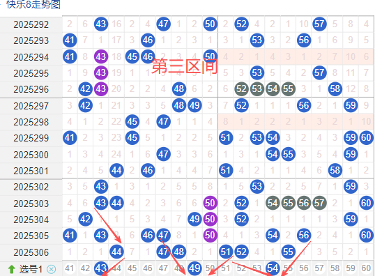 三区间开出了6个奖号(44.47.48.51.52.55)上期回顾三区开出8个奖号上期的三区间的奖号数量呈现一个递减的形态,4头回补3个,本期先来看号码43近期出现频率相对来说还是很稳定。偶尔有时间隔期数也是很长,说明其在近期的开奖中较热的,号码49在近 30 期内出现次数相对还不是稳定的号码,近期的活跃度也是较一般。号码54有一定的间歇性,通常间隔5-3期会出现一次,没有明显的连续出现态势,走势相对较稳定,在整个第三区间的表现本期还是可以防守的。号码57走势相对近期较一般,近期没有连续间隔落号的情况,活跃度近期处于较稳定状态注意防守。