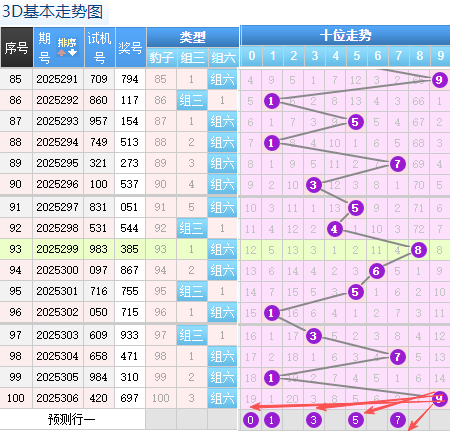 上期3D十位开出的奖号是9号,上期在十位上9号球这个号码在上期是一个冷码的落位点,本期来看5号和3号球在十位上要注意这两个号码是有机会继续顺着上期的9号球继续走出两个常搭配落位趋势这里的两码注意防守一码就好了,然后7号球还是一个大号码这里也是一个小周期的常搭配的落位点,再来看0号球是冷码的回补这个点位参考就好,1号球这里的号码要防守能走折返的概率注意研判。