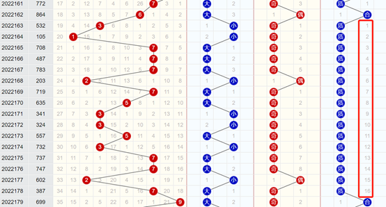 我们看到上图,这个就是前段时间3D号码中间数字的走势分布图,如果把历史数据拉回到2022163期当期开奖号码是532,这个时候中间数字就是3,那么这个是3就是质数,显而易见中间数为质数再那段时间内走出了大热,从163期开始到178期结束,整整16期3D中间数字都开出了质数,如果我们回到179期,毅然决然的会选择3D中间数字为合数的开出,这样就排除了一半的废号,那么179期开出的中奖号码是699,中间数字是9,为合数,那么久说明我们判断成功了,这个就是中间数起到的作用。
