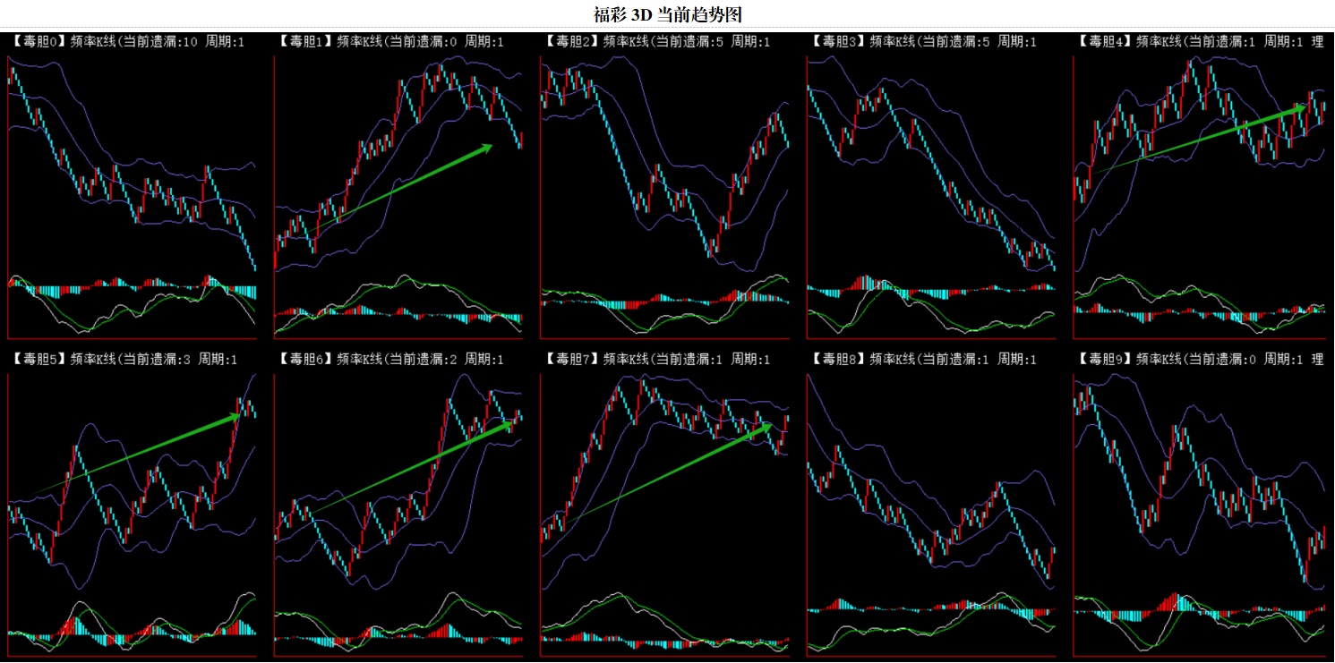 整体趋势上行,上边沿线趋势向上,下边沿趋势也是向上,节点震荡,当前遗漏1期,本期关注。