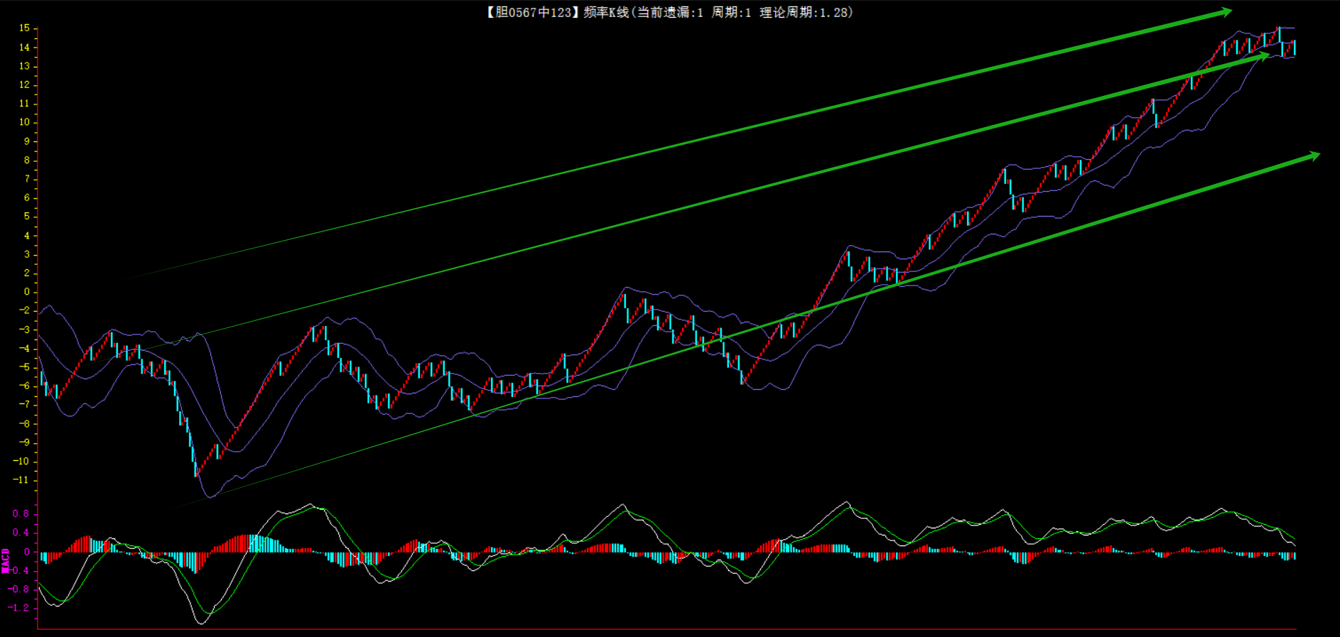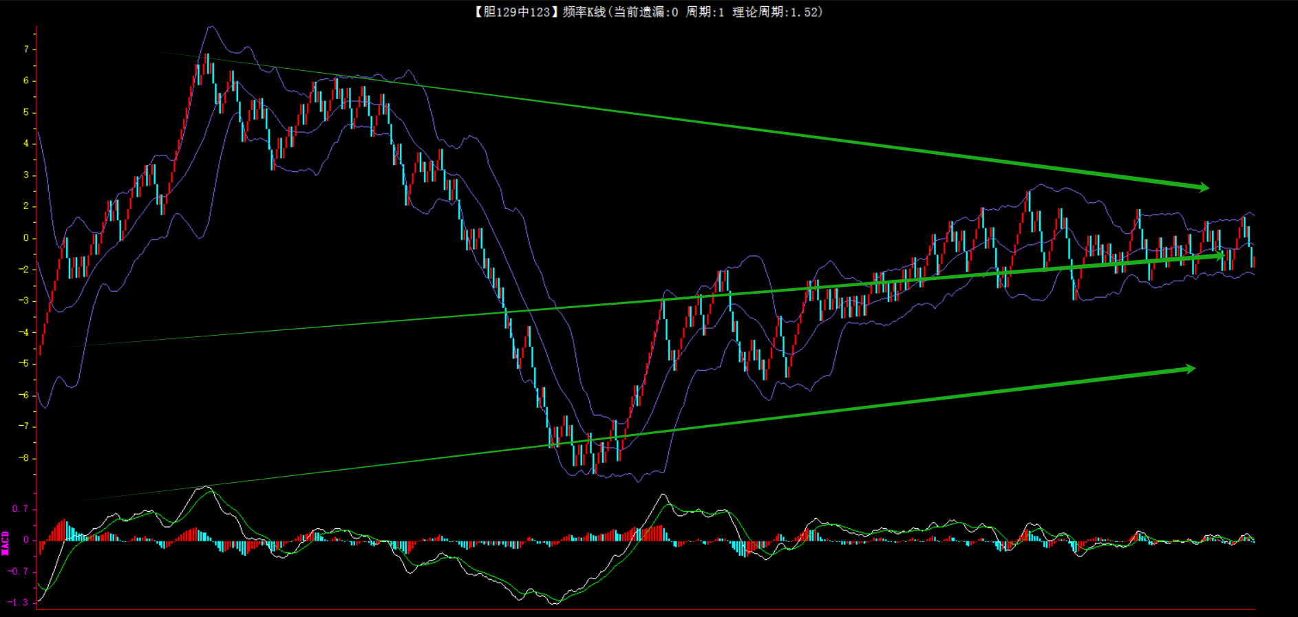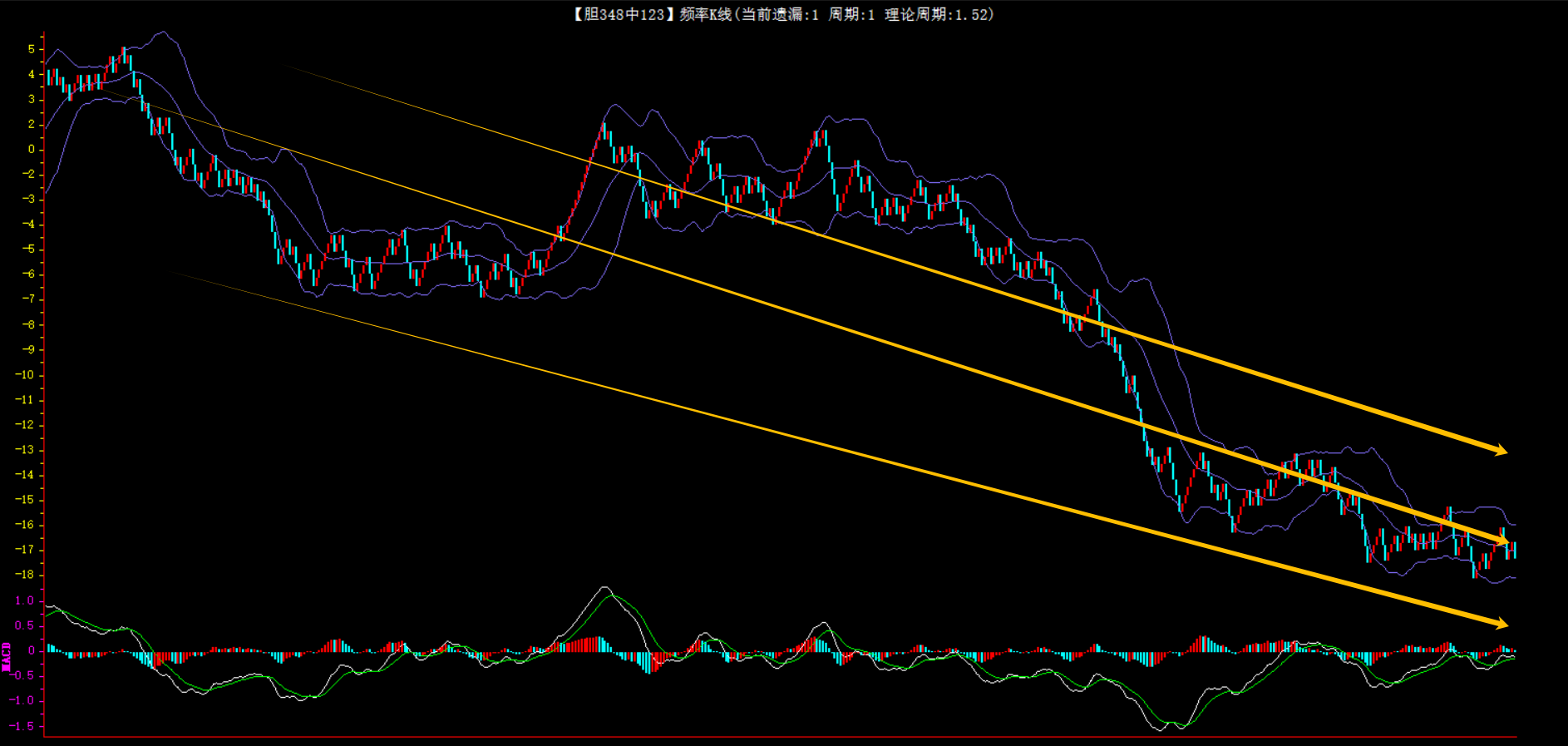 整体趋势下行,上边沿线趋势向下,下边沿趋势也是向下,节点震荡,当前遗漏1期,本期防守。
