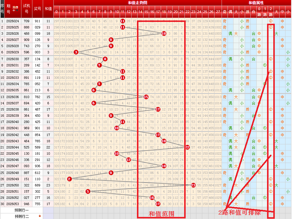 从上图可以开出,按和值大(14-27)小(0-13)分区,上期开出和值大,按近期趋势和跟随表现,本期和值大小都有可能。