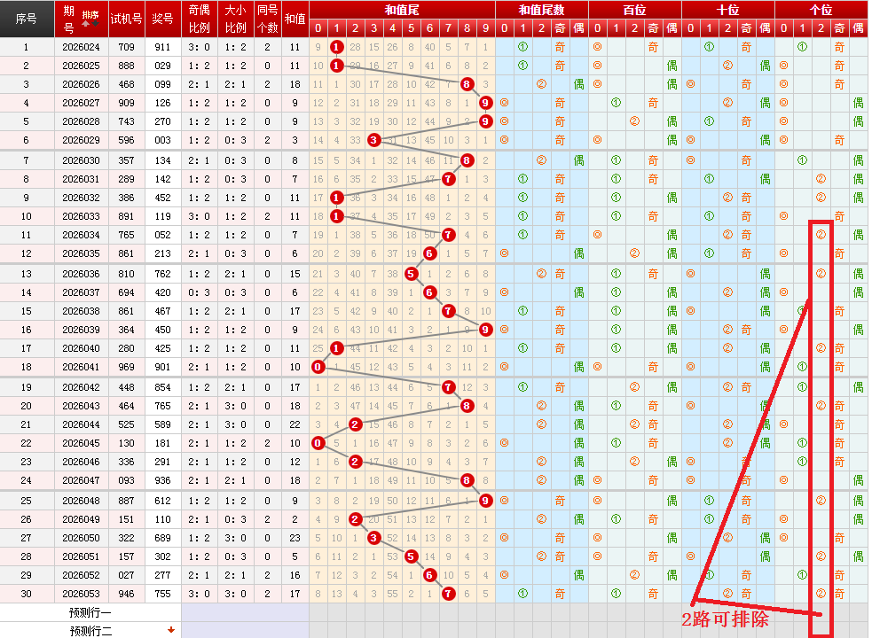 近30期和值奇共开出18期,和值偶共开出12期,和值奇数量优势。近五期分别开出2奇1奇1奇2奇3奇,奇数强势。观察各位置奇偶分布情况,上期开出和值奇,本期和值奇偶都有可能。