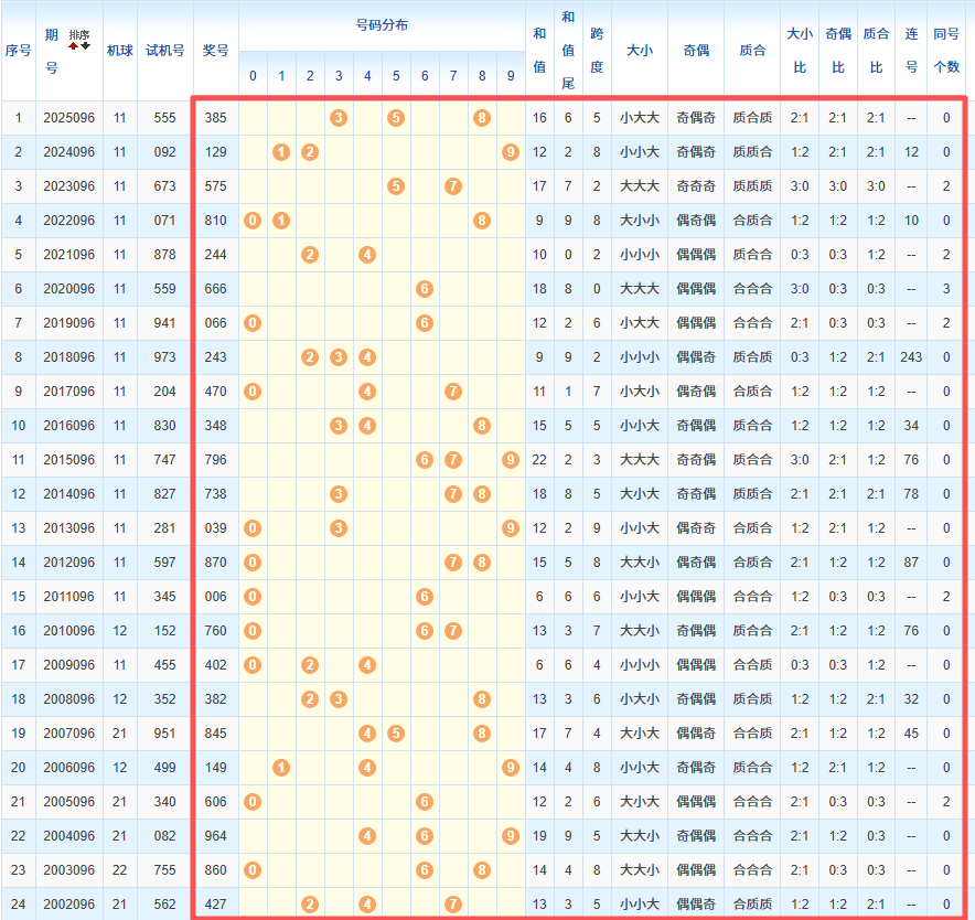 1、统计往年同期开奖号码