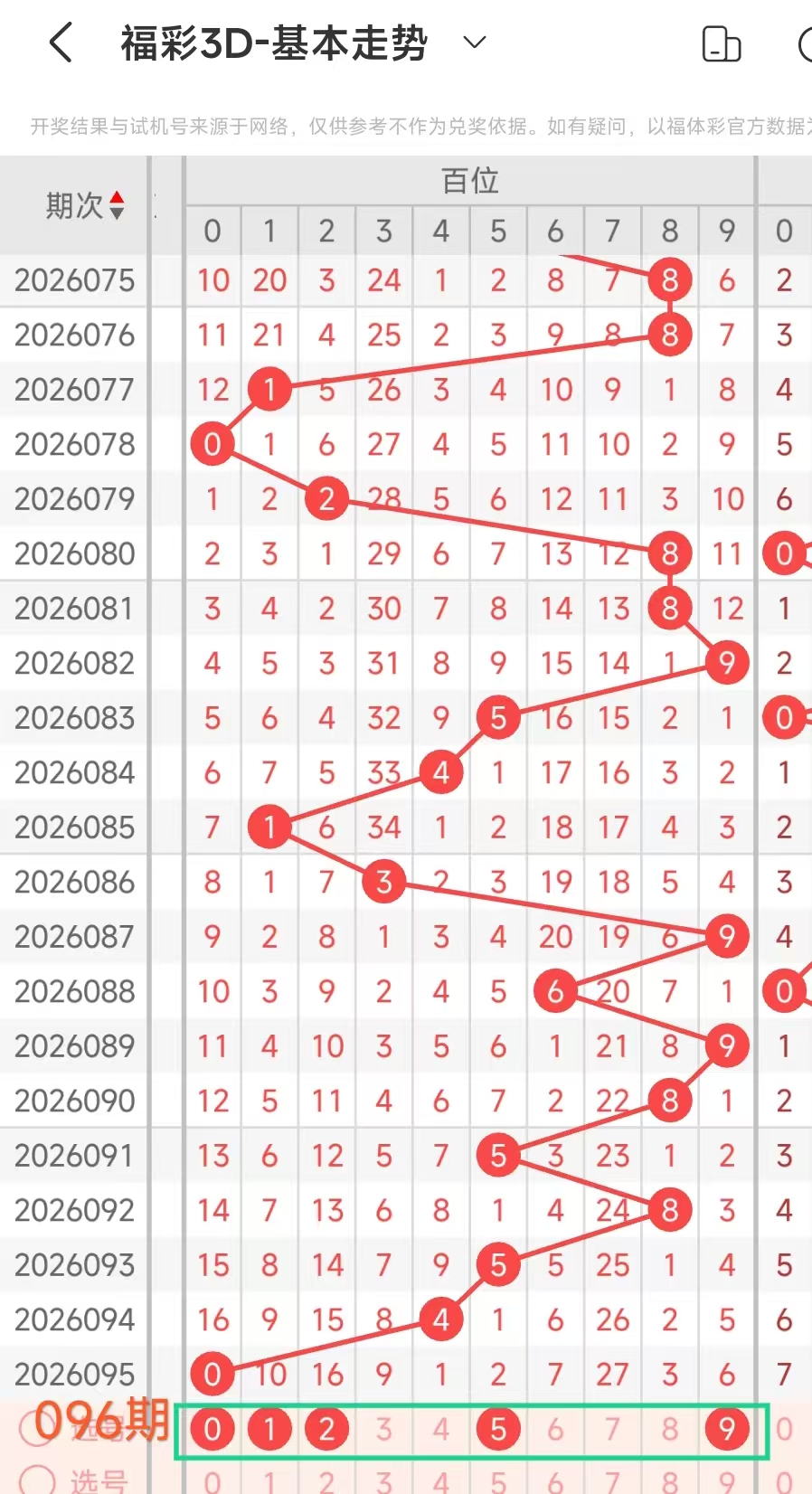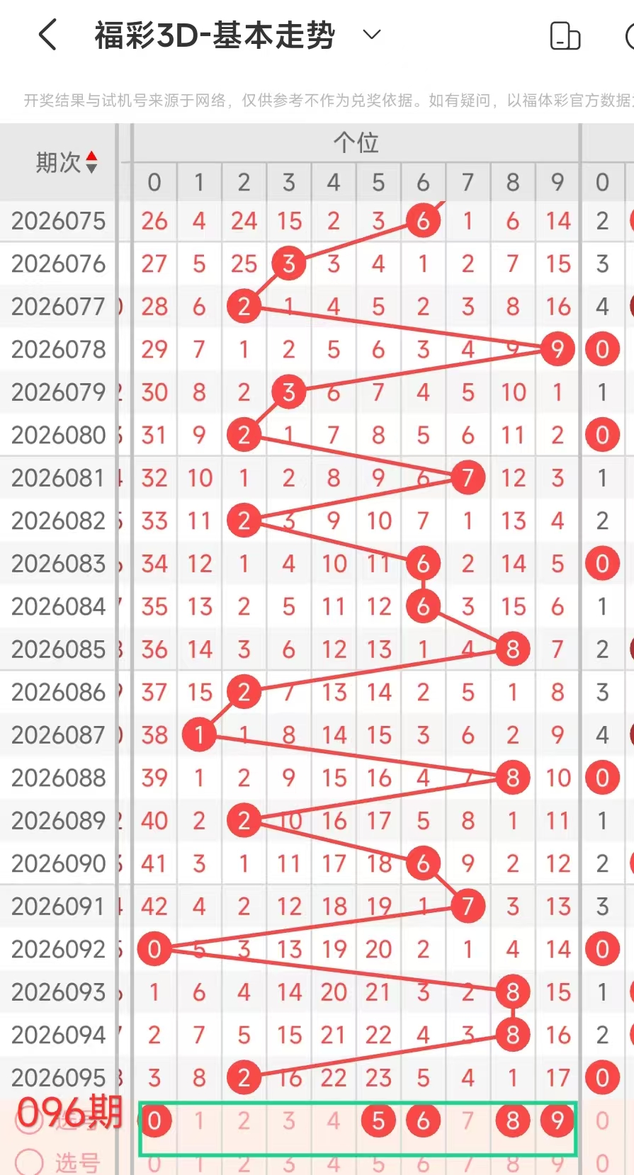 我们选取上期开奖号码022、在一起彩APP上截取前100期的数据,分别记录当开出0、十2、个2、后下期开出什么号记录下来,然后一一分析。