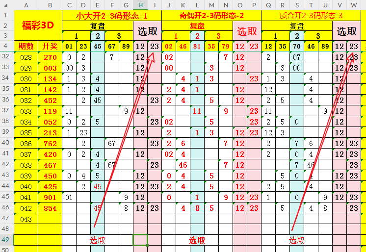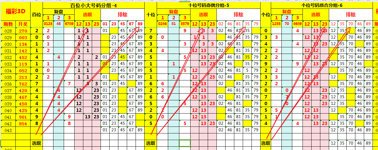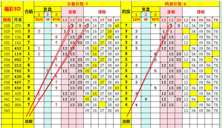 福彩3D和值范围为0–27,和值尾(合值)与跨度范围为0–9的十个数值吻合。分别将合值及跨度值进行分组即;分别划分为“复盘、选取、排除”列。复盘近期数据如下: