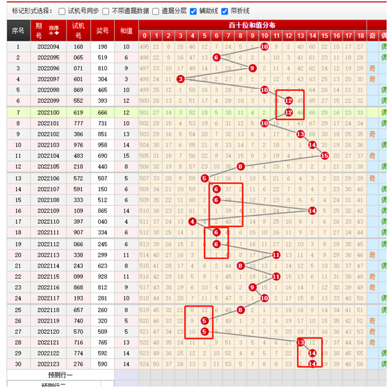 第二我们在来观察百十和走势与下期胆码是否有必然联系呢,我们继续看走势图表