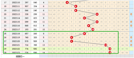此时就不一一举例了,我们可以看到方框内数据,一共是整整6期,按照我们的办法排除废号,仅仅错了一期,效果还是非常不错的,所以百十和用来排除下期胆码效果也不错,值得选择。