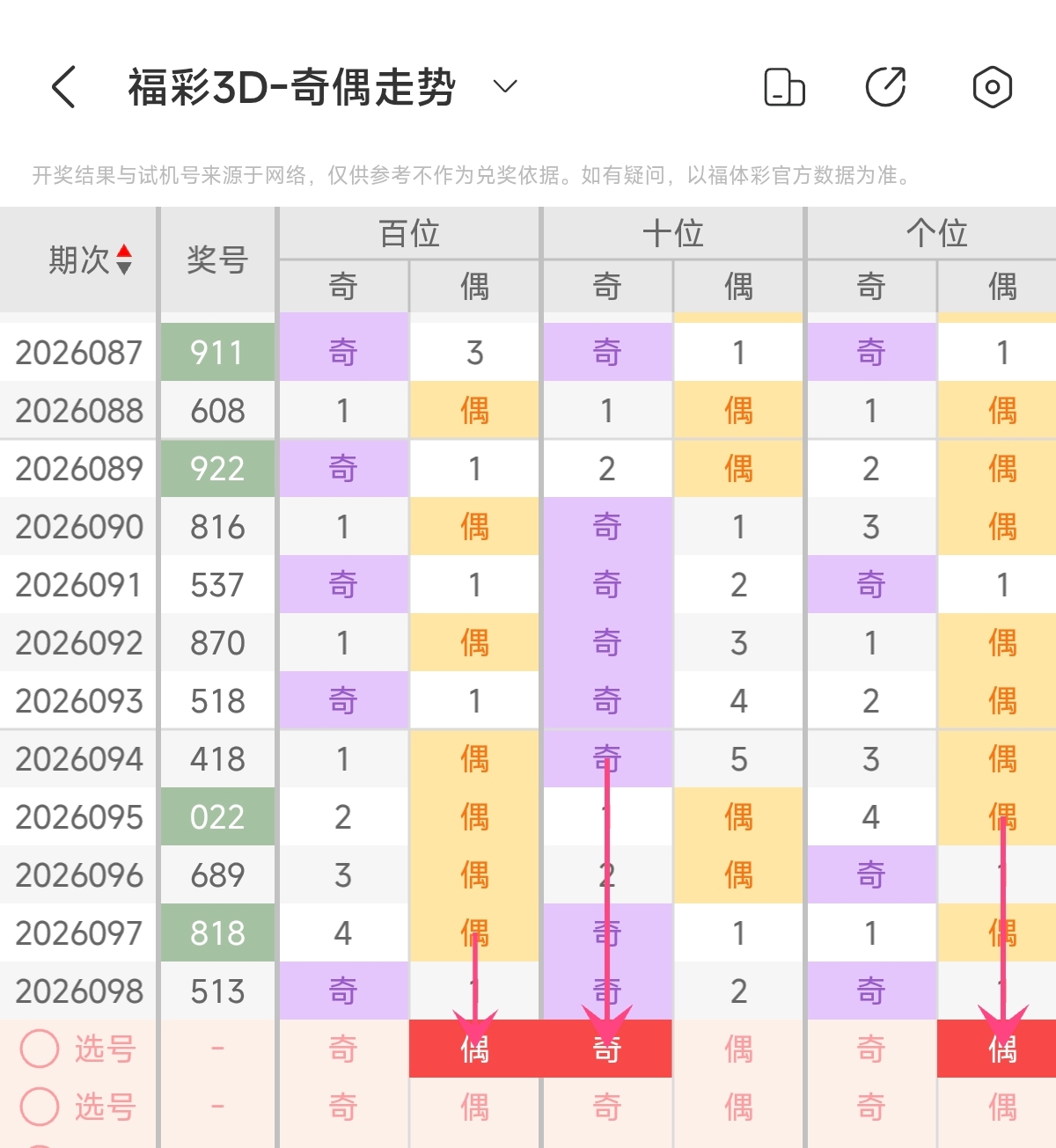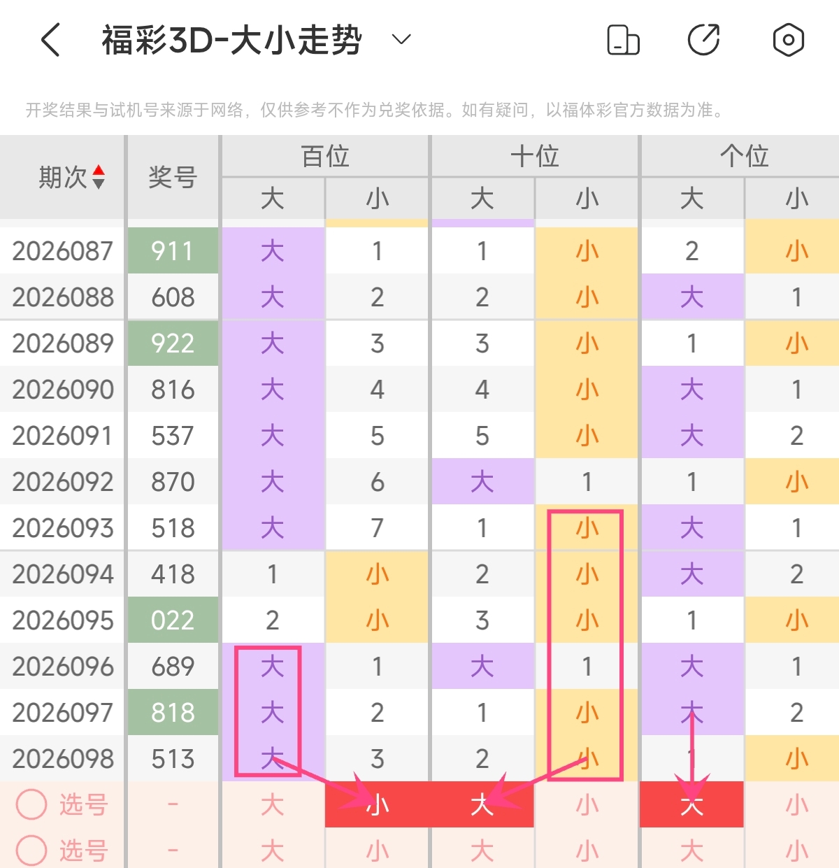 首先让我们回顾一下上期福彩3D第2026098期开奖号码为513,为组六形态,大小比为1:2,奇偶比为3:0,跨度为4,和值为9。