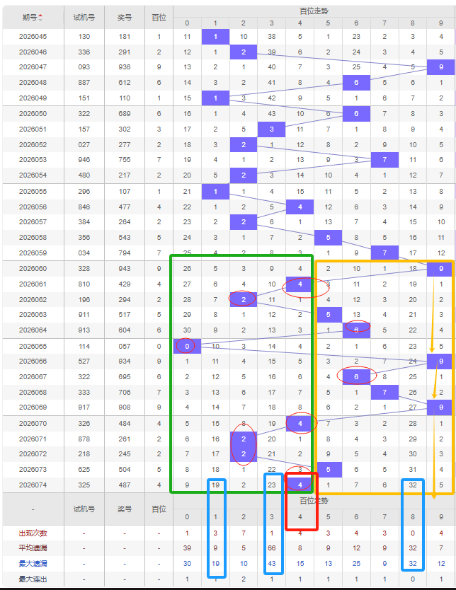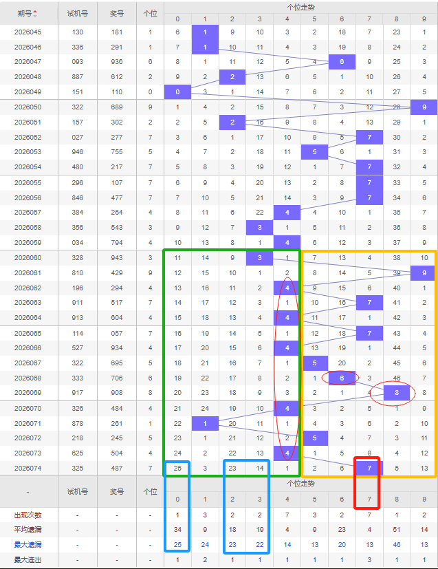 福彩3D第2026075期个位先分析奇数偶数,近十五期开出奇数号8期,开出偶数号7期,开出偶数号的概率比开出奇数号的概率相差不大。近十余期都是奇数偶数间隔开出的,上一期又开出了奇数7号,本期还是看好增加偶数,建议考虑遗漏期数较大的偶数号,比如0号、2号遗漏十期以上且达到平均遗漏期数和最大遗漏期数,都可以防冷号开出。4号若开出则行成3-2-1的形态。