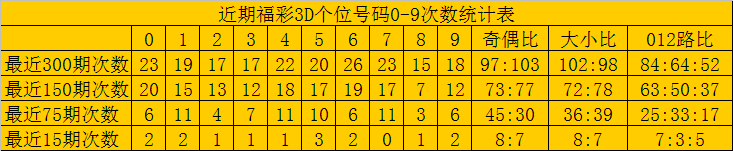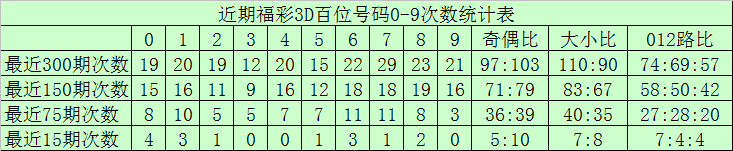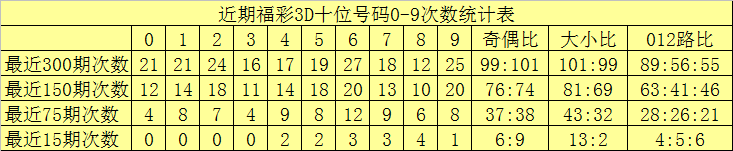 最近15期奖号由冷到热表现为:3、4、9→0次,2、5、7→1次,8→2次,1、6→3次,0→4次,奖号奇偶比为5:10,大小比为7:8,012路比为7:4:4。