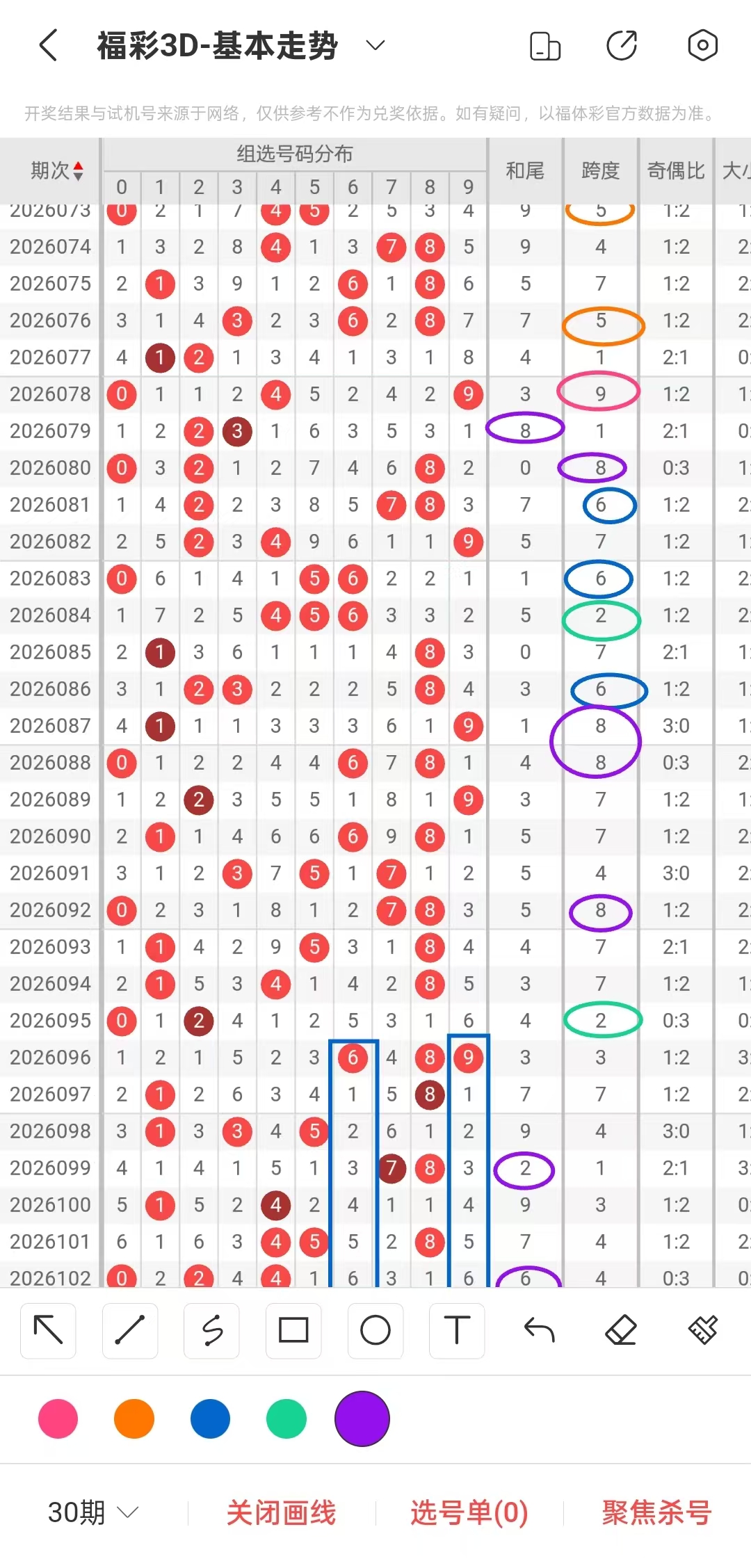 3.近30期中,跨度7出现次数最多为热跨度(后面可能走冷),2跨度近期是出现2次,跨度9近期出现1次,跨度6近期是3次且前段时间冷了两次30期需要回补,6跨和冷8跨后面可能走热,5跨目前最冷,所以近期需要重点关注2.5.6.8.9.跨度。