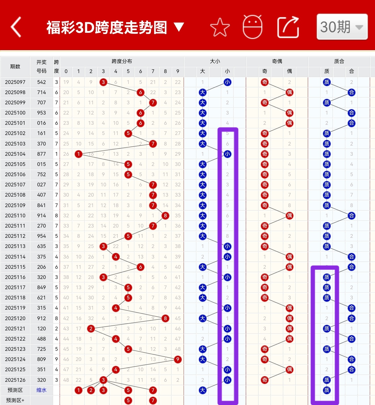 1、跨度:126期跨度3,从近30期数据看,在质合走势中,质数已经连续2次是单出的,通过对比近200期数据发现,本期质数连出回补概率增大。在大小走势中,短期内小数连出最多2期,当前已经连出2期,本期关注大数回补。所以,本期跨度关注奇数12357,重点关注57。