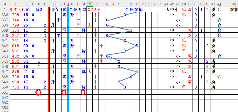 如上图3,和值升降平分析,和值升概率大,大于17和值