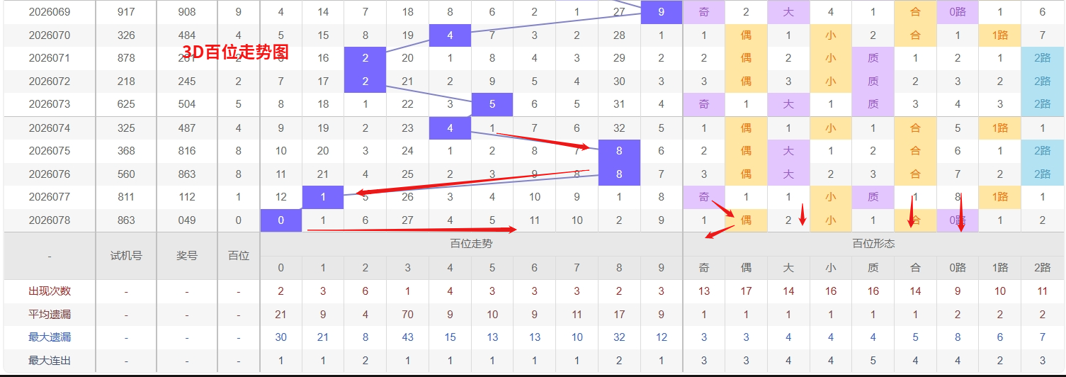 福彩3D百位分析:第2026078期百位开出号码0属于小偶数,从上面百位走势图上可以看出近100期大小比约为45:55奇偶比约为52:48。近期数据还是比较极端的符合文章开头介绍的求均衡规律非等量现象。但这种均衡不会持续最终会被偏态运行打破,然后循环往复。但短期内大小相差1点,大数过热小数有回补需求本期个人认为走小数的概率更高。上期百位落号“0”号球,在百位号码开出0路号码0后向小数方向走出1个振幅。那么通过分析上期百位落位号码分析,号码走出1个振幅,号码走为小偶数,开出0路号码0。通过对百位落号趋势来分析,百位号码落位前端,通过对近10期的走势来看百位号码大小交替频繁走3期大数又走2小数, 近期3D百位走势来看,当前号码分布呈现出明显的冷热分化格局,其中3作为近期的冷号代表,在百位上已长时间未露面,按照概率回归原理,冷号积压后的回补需求正逐步增强,本期需重点关注其反弹可能性;与此同时,4在近阶段百位开奖中表现极为活跃,不仅出现频率高且常伴随连开或隔期再出,已然确立为当前的热门重心,面对这种热号惯性,防守策略必不可少,在选号时既要预留冷号3回补的空间,也要做好热号4继续走热的防范准备,综合两者走势特征灵活布局。我们在百位关注的重点在34578这5个号码球上,百位号码近期奇偶切换频繁,0号球码属于0路号码偶数,现偶数开出过多有向奇数的趋势。所以福彩3D第2026079期百位看34578