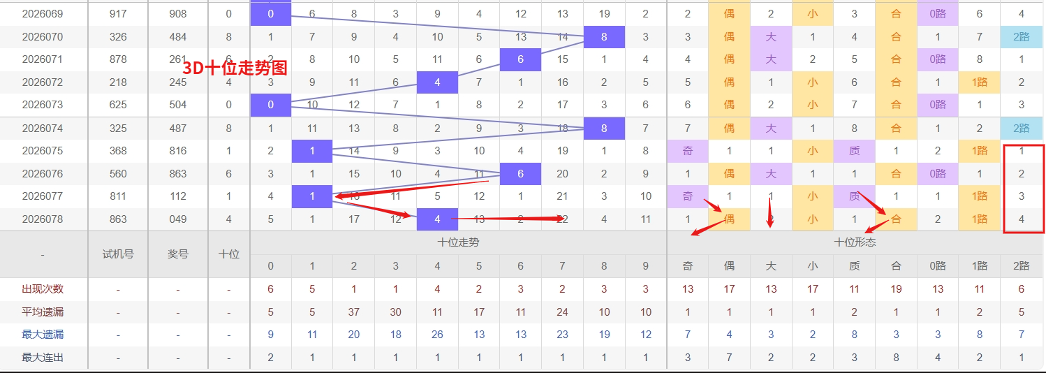 福彩3D十位分析:第2026078期十位开出号码4属小偶数号码前端。以历史100期数据为例十位奇偶比约为54比46,大小比约为51比49近期大小相差3点,根据求均衡的规律开出小数的概率比大数高一点。上期我们分析奇数经过连续回补后有走偶数的可能,开出奖号4小偶数符合我们的预期, 近期3D十位走势来看,数字0在十位上的表现格外抢眼,不仅出现频次居高不下,更呈现出连续落号的强劲势头,这种热度惯性往往难以瞬间冷却,因此本期对于0在十位继续连下的情况必须重点考虑;反观数字2则在十位上沉寂已久,属于典型的冷号状态,随着遗漏值不断拉大,其潜在的回补动能也在持续积蓄,存在随时突袭的可能,值得严密设防。综合当前十位号码的冷热分布特征,采取“追热防冷”的思路,既要顺应0的热号趋势将其纳入重点组合,也要为2的冷号回补预留空间,所以福彩3D第2026079期十位推荐02589。