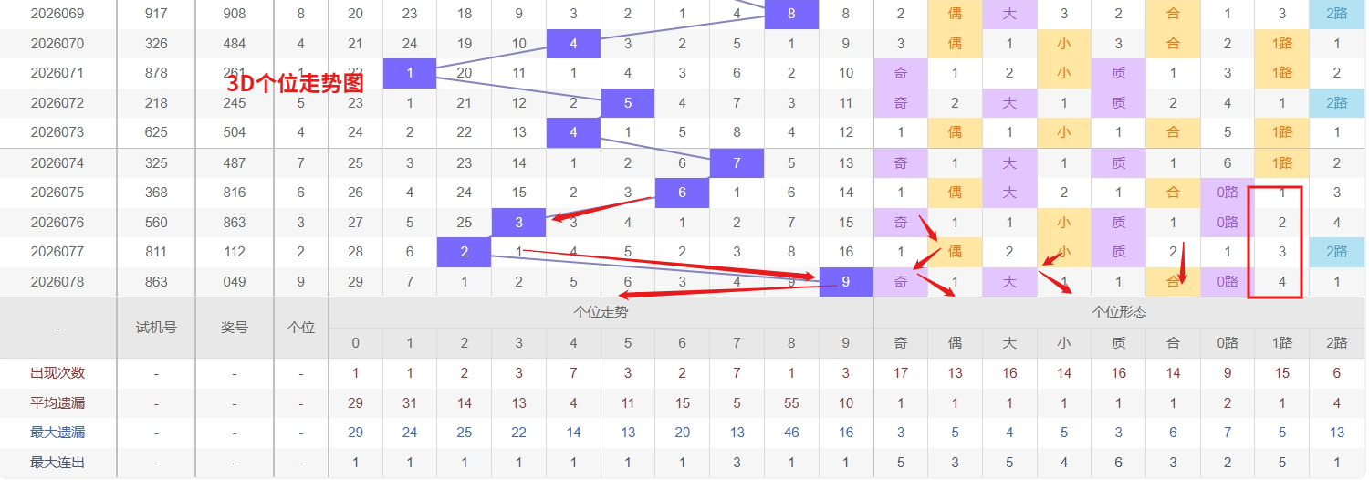 福彩3D个位分析:第2026078期个位开出号码9属于大奇数后端,从以上个位走势图中可以看出近100期的大小比约为48:52奇偶比约为55:45大小奇偶数据上有点差异有需求但不是太明显,不太好看这时就要借助连线走势和遗漏数据来帮助我们缩水号码。上期个位落号“9”大奇数0路号码球,号码开出了7振幅,连续多期的小振必被大振幅取代幅符合我们的预期,那么本期我们在个位考虑振幅走势走前依然要转变思路考虑大振幅,具体考虑(2-6)个振幅是我们主要的方向,那么在对个位落号情况进行系统的分析时我们可以明显的看到个位号码走势呈现大范围震荡,尤其是在号码的落位特点上表现的尤为突出,那么本期我们在个位分析时就要注意号码的风险,避免出现踏空。 近期3D个位走势,号码分布呈现出显著的冷热分化态势,其中0和1在个位上均已处于较长时间未出的冷态,随着遗漏周期的不断拉长,依据概率均衡原则,这两个冷号在本期具备较强的回补需求,务必提前防范;而数字4则在个位上表现极为活跃,不仅近期频频亮相,更隐隐带有连庄趋势,热号惯性强劲,存在继续连下的可能性。综合个位当前的运行轨迹,在选号时采取“冷热兼顾”的策略,既要重点盯防热号4的惯性延伸,也要为冷号0与1的集中反弹预留位置,因此福彩3D第2026079期个位看好01346。