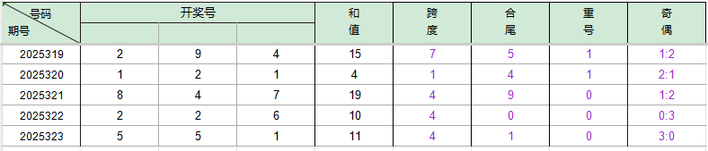 2025319期开奖号码294,我们可以看出近30期百位2出现2次,十位9出现3次(较321期减一),个位4出现4次(较323期减2)。