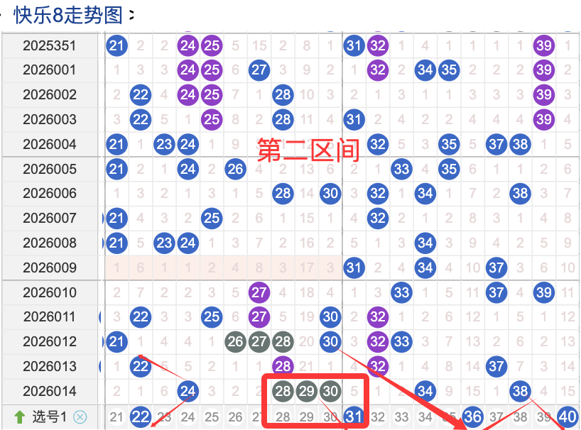 ·上期二区开出6个奖号(24.28.29.30.34.38)上期回顾二区开出6个奖号二区间在上期落位同比前期的话呈现了一个递增的落位趋势,先来看本期号码22整体活跃度较热,在近 30 期里有一定的间歇性出现,不是每期都开,近期整体走势还是很稳定。号码31近期热度较热,间隔性还是很好,说明其在当前阶段活跃度较热注意防守。号码36近期活跃度较冷,有一定的间歇性近期整体走势相对不是平稳有特别明显的冷热趋势变化,号码40近30期内活跃度较冷,没有明显的连续出现形态走势,整体表现比较动荡不是很稳定。