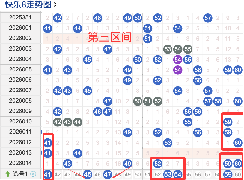 三区间开出了5个奖号(43.49.52.59.60)上期回顾三区开出5个奖号上期的三区间的奖号数量呈现一个递增的形态,4头回补2个号码,本期先来看号码41近期出现频率相对来说还是很稳定。偶尔有时间隔期数也是很长,说明其在近期的开奖中较热的,号码47在近 30 期内出现次数相对较热的号码,近期的活跃度也是较热。号码53有一定的间歇性,通常间隔5-3期会出现一次,没有明显的连续出现态势,走势相对较热,在整个第三区间的表现本期还是可以防守的。号码59走势相对近期较温热,近期没有连续间隔落号的情况,活跃度近期处于较温热状态注意防守。