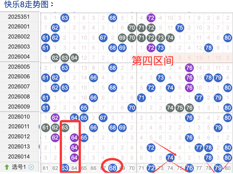 上期四区间开出了4个奖号(64.74.78.80)上期的四区开5个奖号呈现了一个递减的趋势,开出的奖号7头回补2个,6头回补1个,先来看号码63在近 30 期内属于还是很稳定的号码,近期出现频率相对也是稳定的,偶尔会间隔多期后出现一次,这个号码要注意防守,号码68具有一定的间歇性活跃度较热比如有时会间隔 3到5期就再次出现,也有时会间隔多期,近期整体出现频率比较热,近期还是要关注的.号码72活跃度近期比较热,有一定的间歇性。活跃度近期较热,整体走势有一定的波动性.