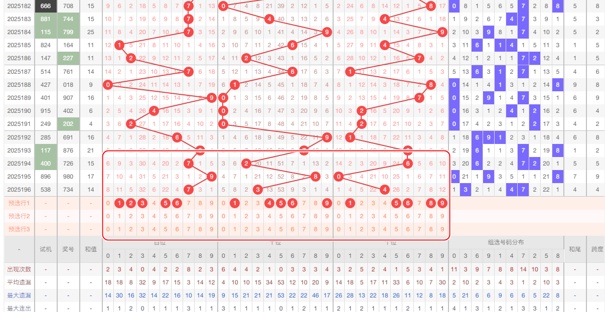 上期十位开出3,本区与上期的跨度为5,本期我们可以从上面走势图中看出选号的思路,本期十位推荐关注:14569
