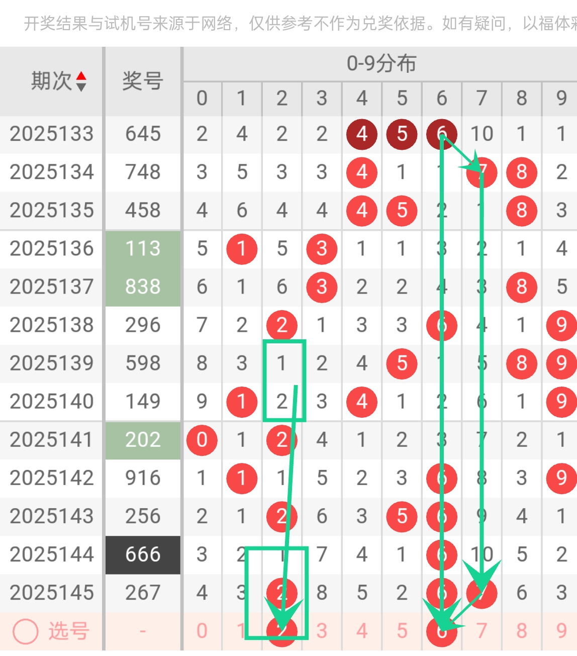 - 胆码 2、6 首次使用,复式剔除前三次所有胆码(0,1,3,4,7)。