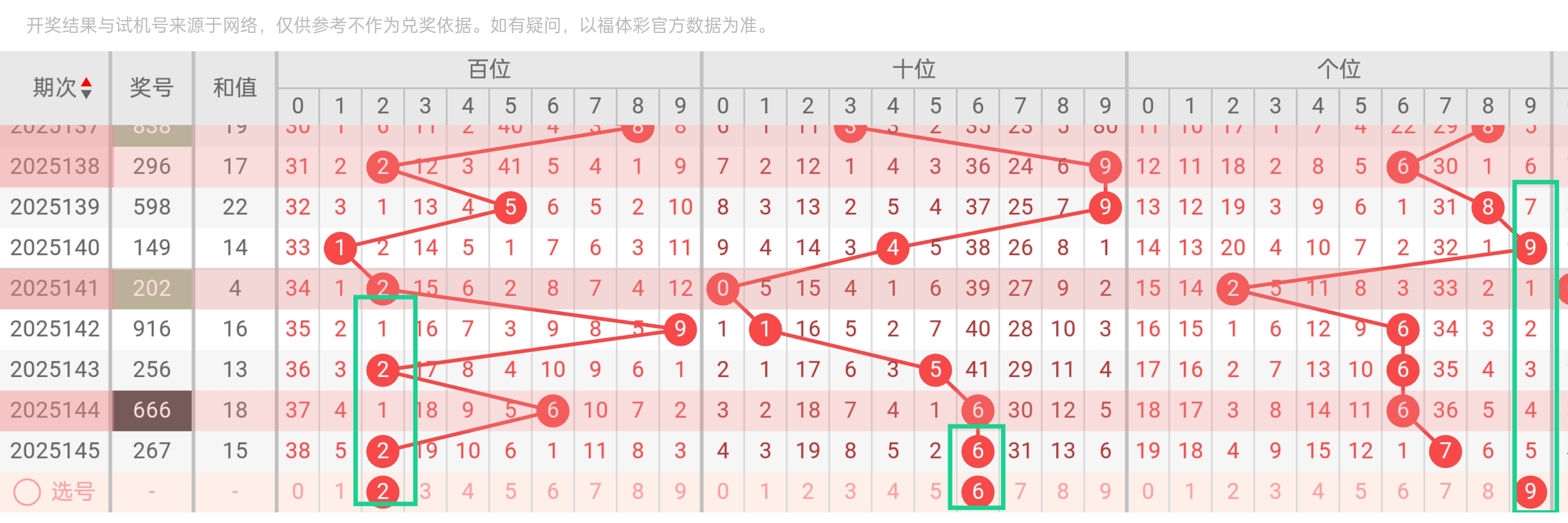 - 十位 2(统治区)+ 个位 6/9(热号区),锁定高频输出位。