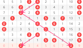 ② :本期福彩3D十位质合走势,根据图上标记规律,最近30期内十位出现出质后出合再出合的规律,此规律已出现一组,如图中所示,据规律概率理论值来分析,本期十位开出合数号概率很大,所以本人分析本期期十位出合号,可以参考十位:04689