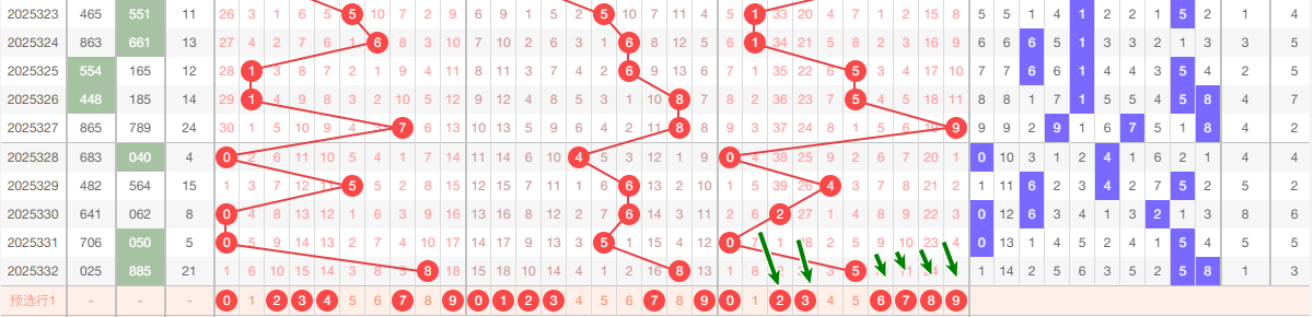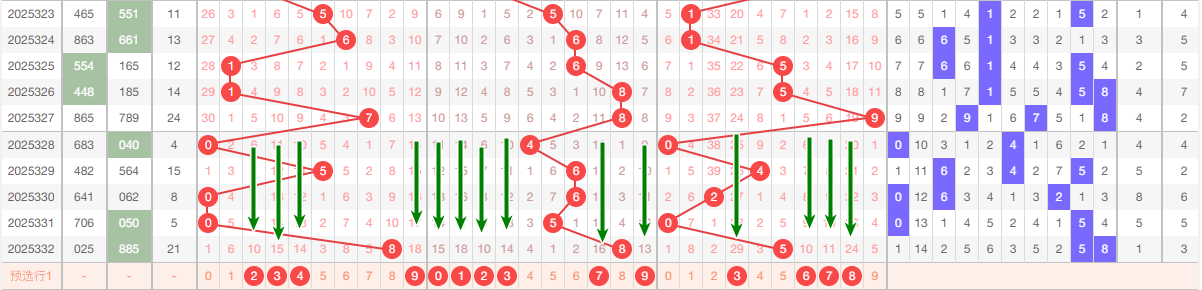 上期个位开出5,本区与上期的跨度为5,本期我们可以从上面走势图中看出选号的思路,本期 个位推荐关注:23795