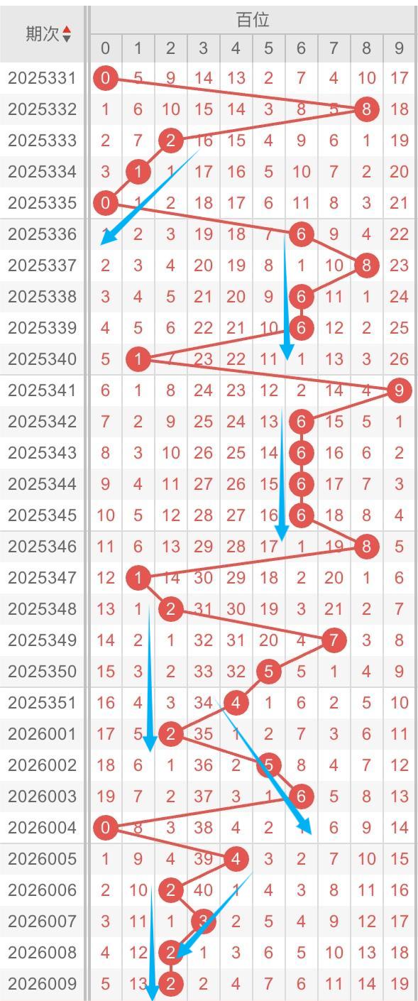 以近30期百位的走势形态分析:斜连和重复两种形态交替出现。例如:数字4-5-6/4-3-2斜连,数字6/2重复开出。本期重点关注:数字2-3-4可能再次开出斜连,同时关注号码2/6的重复。个人分析,仅供参考。